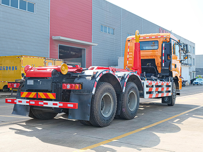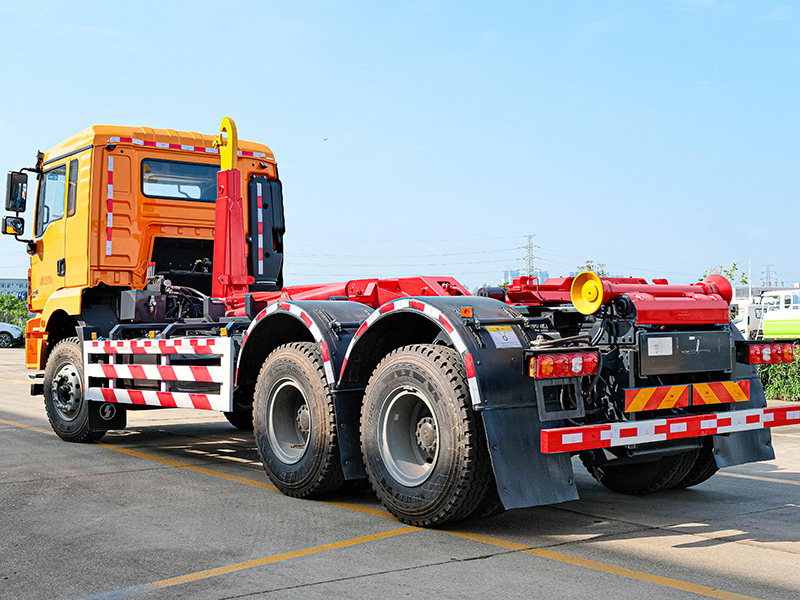 該車可將地下垃圾箱內(nèi)的垃圾及垃圾箱一同拉車上運走同時可自卸,降低了工人的勞動強度。該垃圾車的收運方式是目前世界上廣泛采用的垃圾收運方式,可以實現(xiàn)一車多箱,大大降低了配備成本和空間等等;其專用裝置的功能均以汽車發(fā)動機為動力,通過液壓機構(gòu)手動或電控來實現(xiàn)。車輛的箱體采用優(yōu)質(zhì)炭鋼板全密封焊接結(jié)構(gòu),具有強度高、重量輕、不產(chǎn)生二次污染等優(yōu)點。